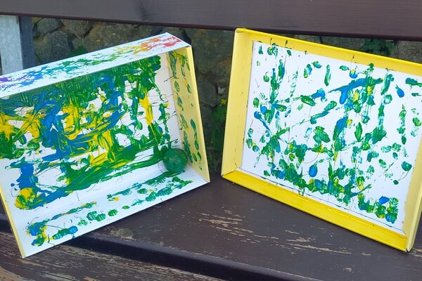 Um die Kreativität der kleinen Einsteins anzukurbeln, hatten wir noch einen verrückten Basteltipp beigelegt: Eine Anleitung, um den Karton auch innen fetzig bunt zu gestalten - und zwar mit Hilfe von etwas Farbe UND dem Flummi in der Box.