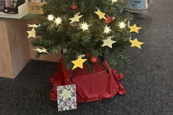 Die Aktion noch einmal kurz erklärt: Den Weihnachtsbaum in unserer Buchhandlung zieren Papiersterne, die mit einem Wunsch und dessen Preis beschriftet sind. Der Wert variiert zwischen 5 und 40 Euro. Neben viiielen Büchern und Spielen stehen auch DVDs und Herrnhuter Sterne hoch im Kurs. Unter diesen Wünschen können unsere Kunden einen auswählen, den sie erfüllen möchten. Nachdem sie bezahlt haben, packt unser Team das Geschenk noch schick ein. Dann erhält es ein Plätzchen unterm Baum, wo sich all die guten Taten unserer Kundschaft bis zum Fest sammeln.
